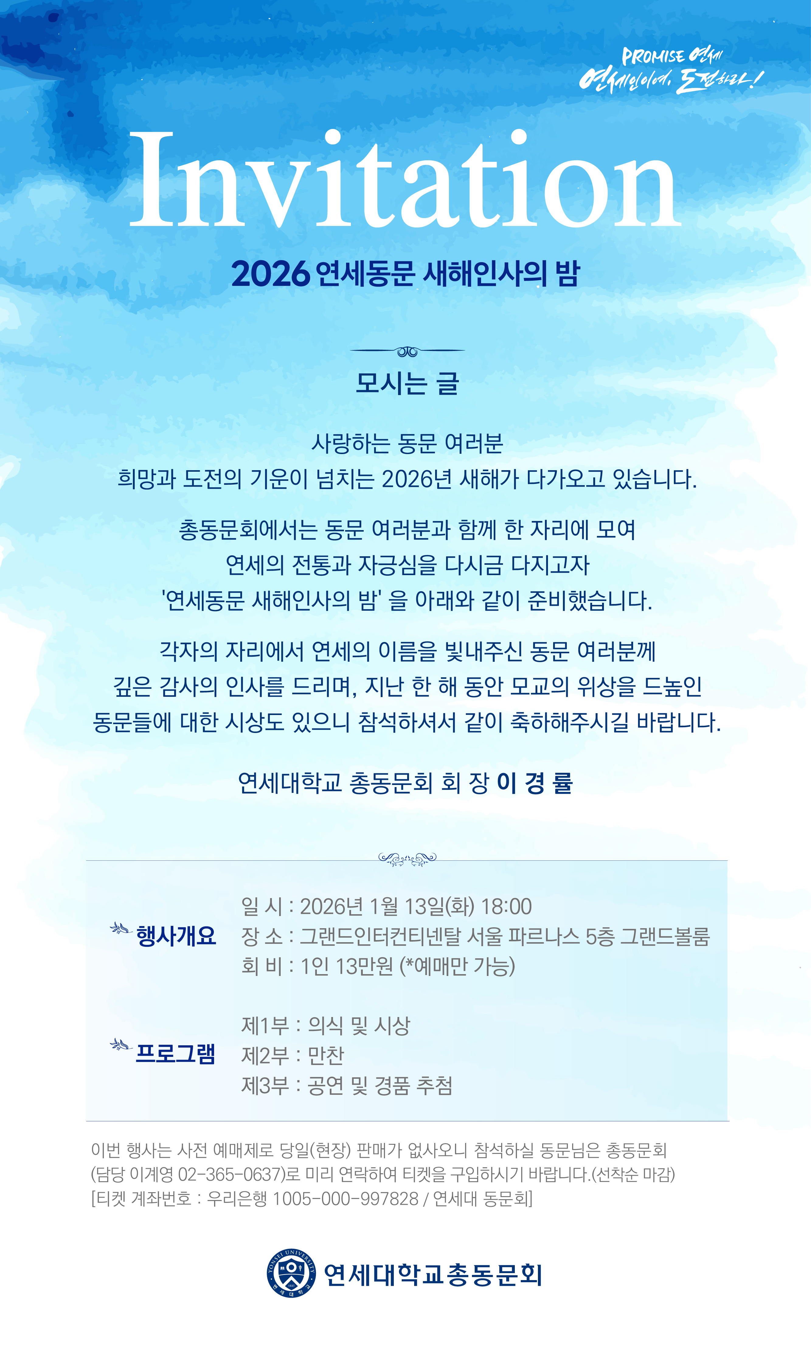 [티켓 계좌번호 : 우리은행 1005-000-997828 / 연세대 동문회]