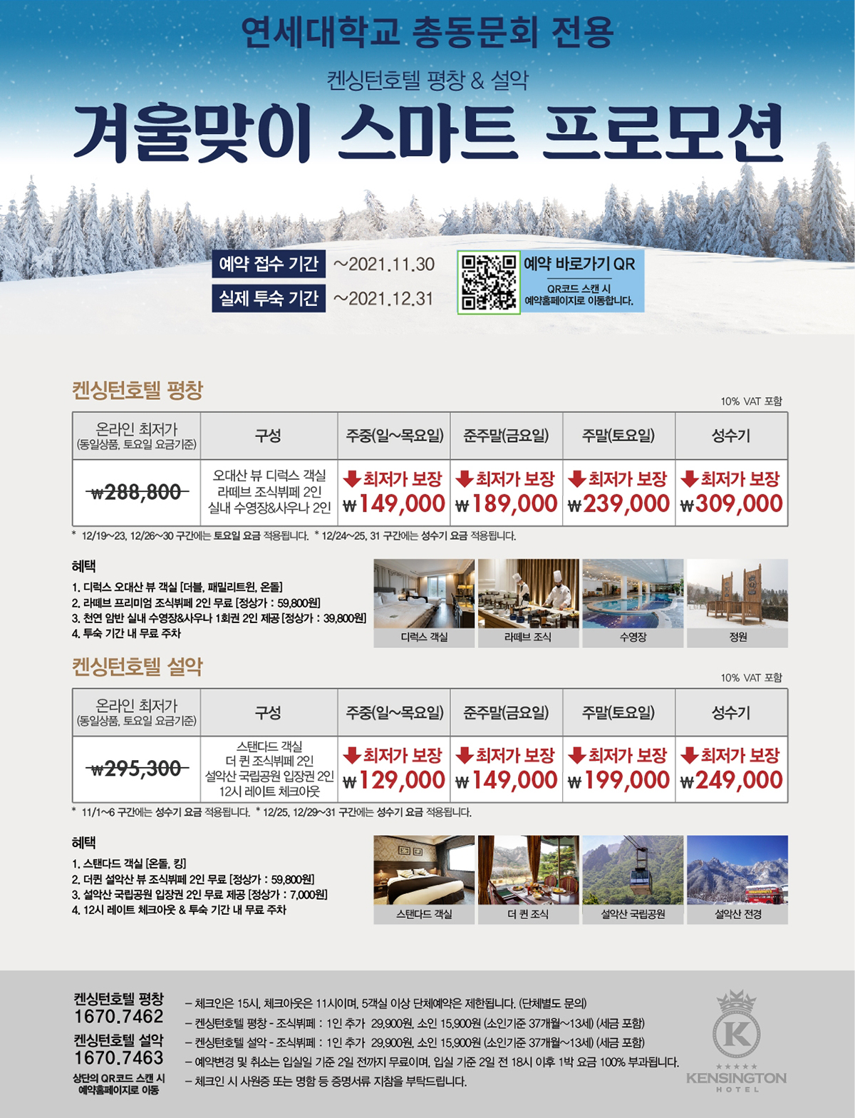 연세사랑 Y카드 이벤트를 알려드립니다.연세사랑 Y카드를 이용하시면 아래와 같이 켄싱턴호텔 평창 & 설악을 할인된 가격에 이용하실 수 있습니다.이외에도 다양한 이벤트와 할인 혜택을 누릴 수 있습니다.
